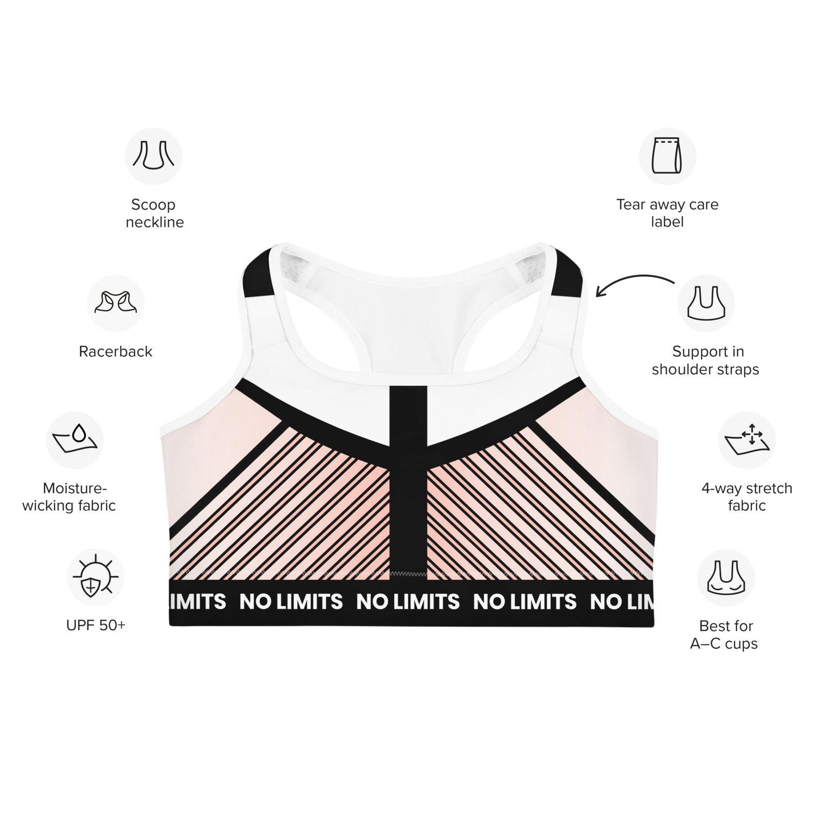 Its supportive yet flexible design offers a secure fit while allowing full freedom of movement. The soft, elasticized band ensures all-day comfort without irritation, and the sleek, minimalist aesthetic pairs effortlessly with any workout outfit. Whether you’re lifting weights, hitting the track, or stretching it out in a yoga flow, the No Limits Sports Bra delivers the ultimate blend of functionality and fashion.