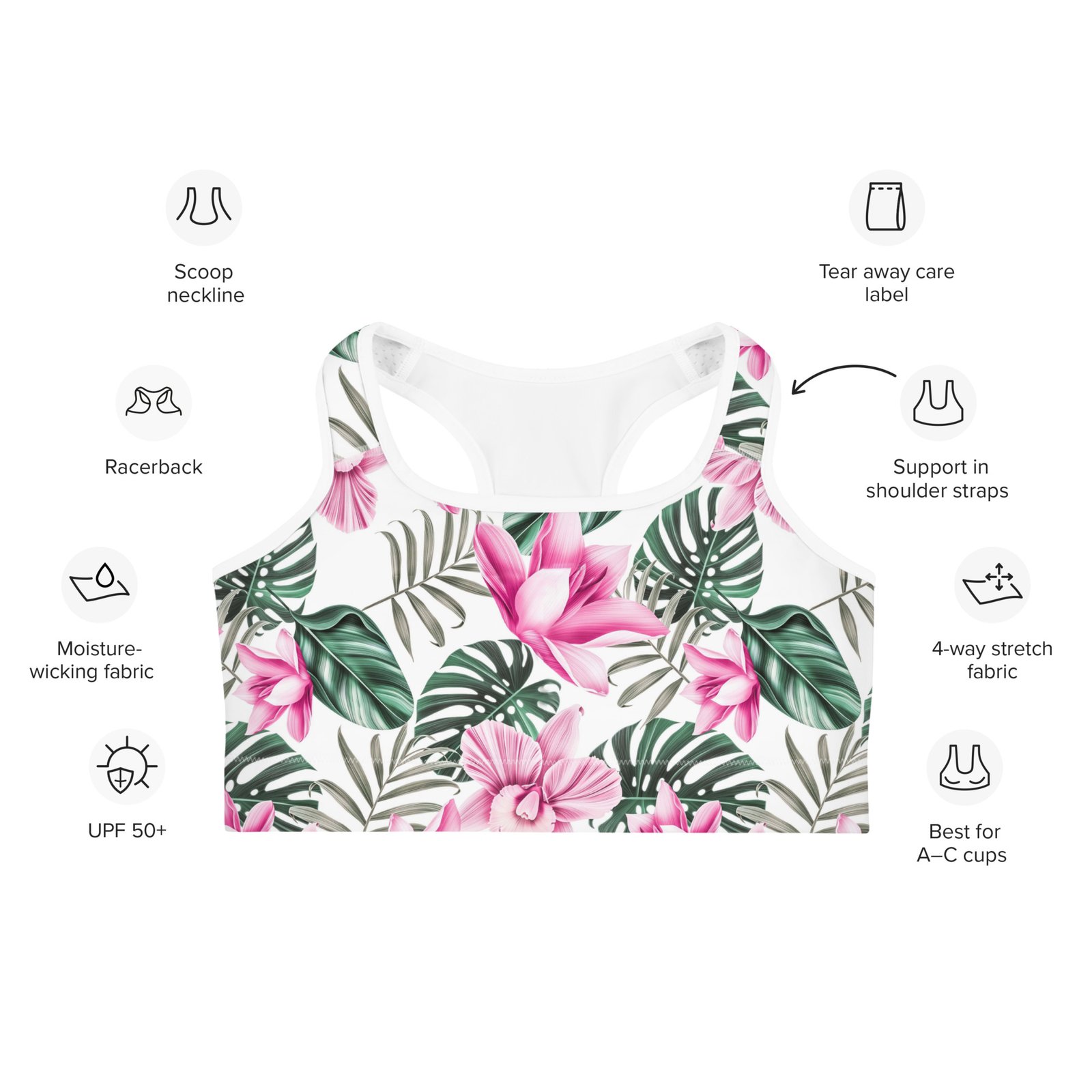 The Tropical Floral Plant and leaf White Sports Bra is your go-to for comfort and support. Made with soft peach skin fabric (82% polyester, 18% spandex), it offers 4-way stretch and moisture-wicking to keep you dry. The racerback design provides freedom of movement and a secure fit, perfect for workouts or everyday wear.
